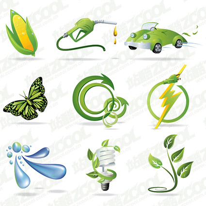 eps format, with jpg preview, the crucial words: vector icon, environmental protection, automobile, leaves, fuel, butterflies, arrows, lightning, the plugs, water, energy-saving lights, green