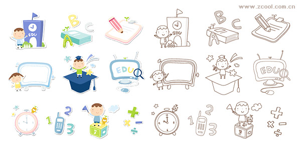 ai formats, including jpg preview, keyword: Vector icons, cute, school, schools, children, people, learning, writing, blackboard, teaching, graduate, find, time, clock, phone, mathematics, multiplication and division addition and subtraction, Vector material