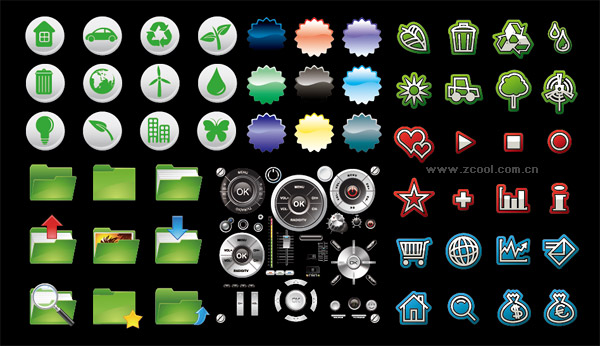 eps format, including jpg preview, keyword: Vector icon, web2.0, web design, environmental protection, file folders, a magnifying glass, arrows, stars, houses, cars, leaves, water droplets, bulbs, butterfly, ok, button, control, trash, trees, heart-shaped, statistics, shopping cart, gear round the Earth, mail, email, wallet, money, material vector